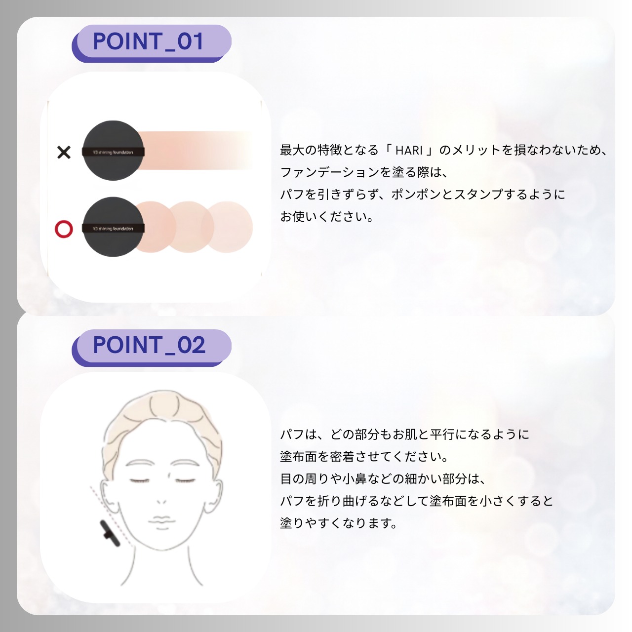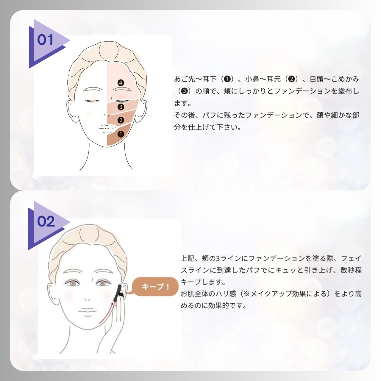 ④最後にパフで軽く引き上げて数秒キープすると、ハリ感をより高めるのに効果的です。