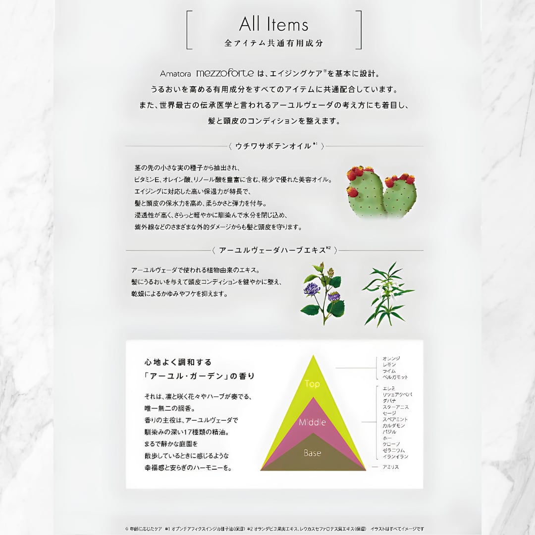 オプンチアフィクスインジカ種子油、シロキクラゲ多糖体、加水分解ケラチン(羊毛)、イソステアロイル加水分解シルク、ココジモニウムヒドロキシプロピル加水分解シルク、キトサンステアラミドヒドロキシプロピルトリモニウムクロリド、オランダビユ果実工キス、レウカスセファロテス葉エキス、スクワラン、ホホバ種子油、グリコシルトレハロース、γ-ドコサラクトン、アルギニン、アスパラギン酸、グリシン、アラニン、セリン、バリン、プロリン、トレオニン、イソロイシン、ヒスチジン、フェニルアラニン、ベタイン、イソマルト、加水分解水添テンプン、ボリクオタニウム-10、ベヘネス-30、ベヘントリモニウムクロリド、ステアロキシプロピルトリモニウムクロリド、BC、PCA、PCA-Na、PPG-3カプリリルエーテル、PPG-25ブチルリン酸、PEG-60水添ヒマシ油、PG-ヒドロキシエチルセルロースココジモニウムクロリド、イソステアリン酸、インステアリン酸水添ヒマシ油、クオタニウム-18、フィトステロールズ、エチルヘキサン酸セチル、メトキシケイヒ酸エチルへキシル、ベヘン酸、ダイマージリノール酸ダイマージリノレイルビス(ベヘニル/イソステアリル/フィトステリル)、ラウロイルグルタミン酸ジ(コレステリル/オクチルドデシル)、クエン酸、クエン酸Na、 乳酸、乳酸Na、ジメチコン、アモジメチコン、イソペンチルジオール、プロパンジオール、セタノール、ステアリルアルコール、トコフェロール、クリセリン、エタノール、フェノキシエタノール、1,2-ヘキサンジオール、カプリリルグリコール、香料